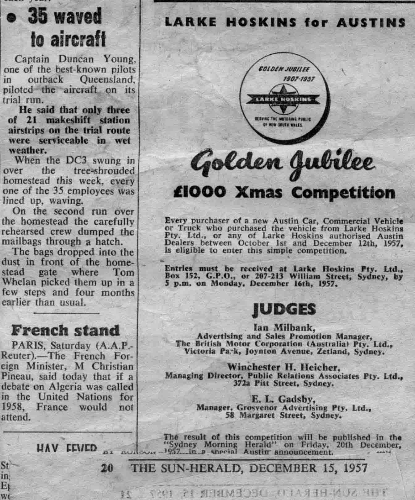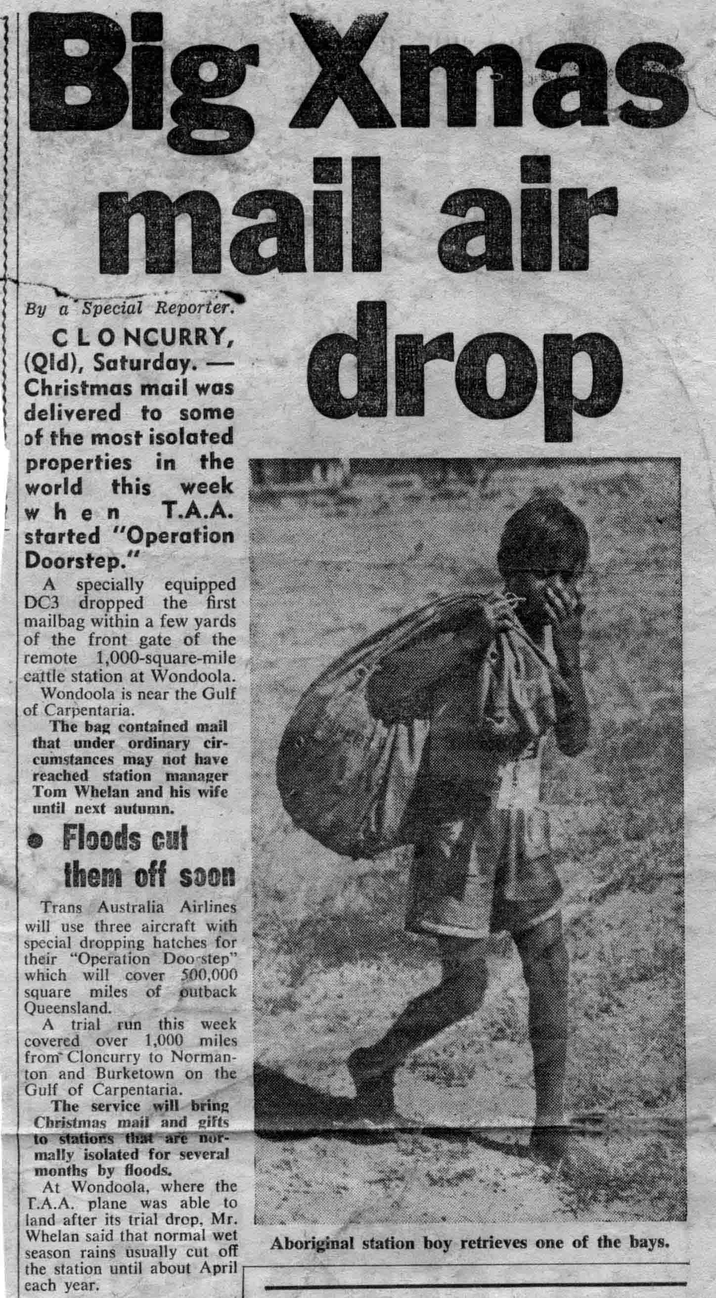 An interesting story from the Sun-Herald, December 15, 1957. Blue flew the first outback mail service for TAA, dropping mail bags from a DC3 to remote communities. (Apologies for the size of these files - the first is 276 KB)